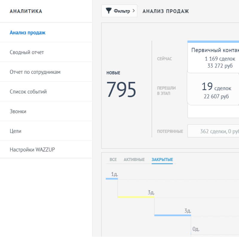 Воронки продаж разделены на понятные этапы, «шаги». Менеджер видит сколько клиентов в работе и на каких стадиях они находятся